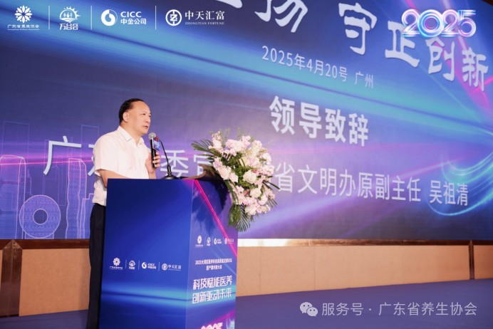 2025年4月20日,由广东省养生协会主办的“2025大湾区医养科技高质量发展论坛”在广州成功举办。本次论坛以“赋能医养科技 共筑湾区健康未来”为主题,围绕康养产业与中西医结合的创新发展路径展开深度研讨。广东省委宣传部精神文明办原副主任吴祖清、广州军区卫生部原部长江建荣、广东省卫生厅副厅长兼中医药局局长彭炜、广东省卫生健康委二级巡视员潘正钦、广东省卫健委副巡视员贾广虹、市发改委、市商务局、市工信局、市科技局、荔湾区政府、白云区政府、黄埔区政府、增城区政府等广东省市政府领导,以及万谷会、中金公司、中天汇富、心血管科及脾胃科专家教授、上市公司、企业代表及大健康产业从业者们等近三百多名嘉宾,共商大湾区医养科技发展新路径,共绘健康中国蓝图。