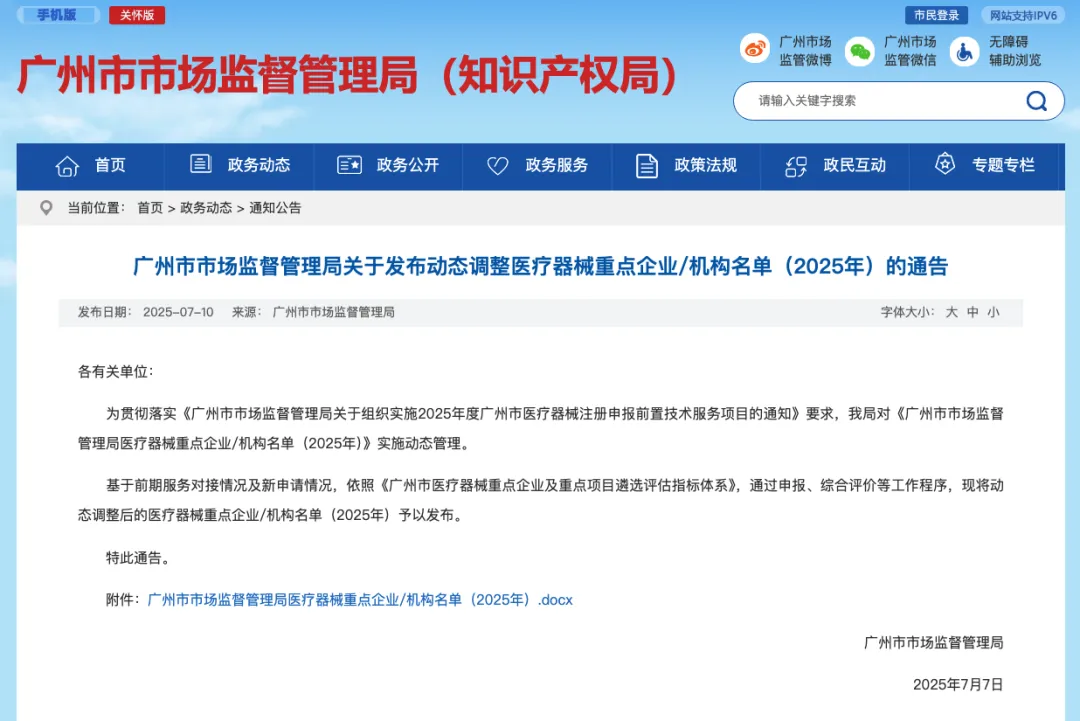 近日,广州市市场监督管理局发布2025年医疗器械重点企业/机构名单动态调整通告。依据相关通知及评估指标体系,经申报、综合评价等程序,嘉检医学成功入选本次调整后名单。